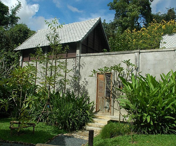 A 2-story detached house, 2 bedrooms, 2 bathrooms. There is no door between the 2 rooms. There will be a spiral staircase to find each other. And there will be a living/hanging out area in front of the room with a view of the stream. The walkway leading up to the house will be rocky with some moss on it. Not recommended for those who have difficulty walking. or a person who has had knee surgery.