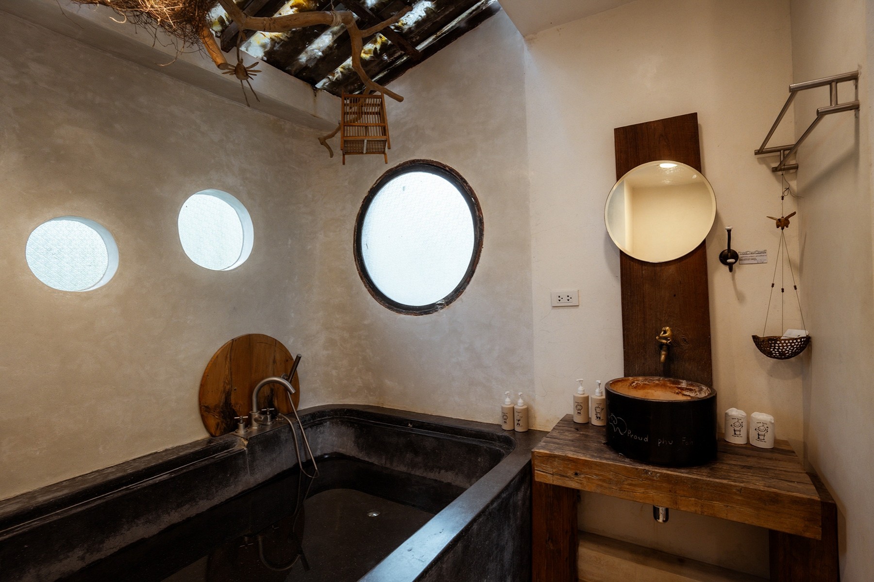 The white wallpaper and big round bathtub on the waterside allow customers to unwind themselves in the nature along with the aroma treatment salts. There is also a dock to sit and dip your feet in the stream.