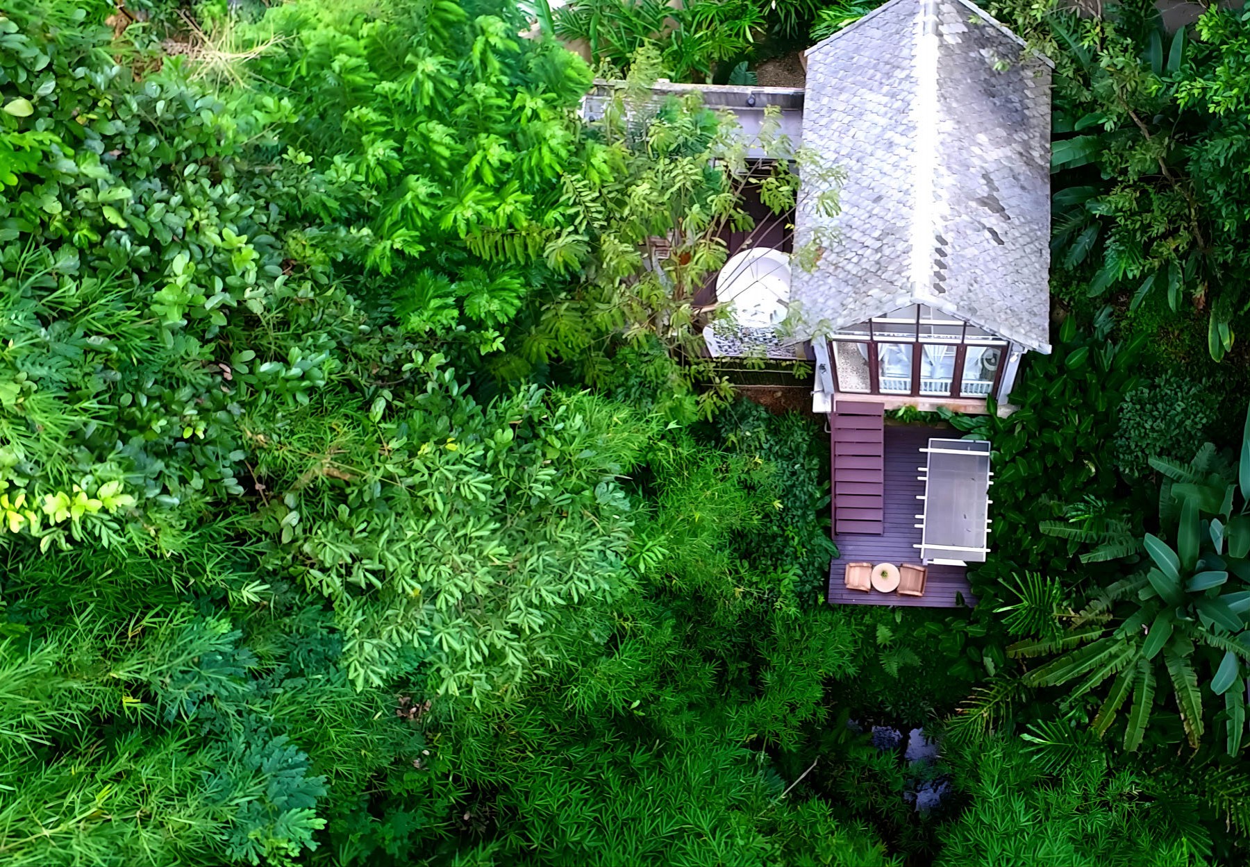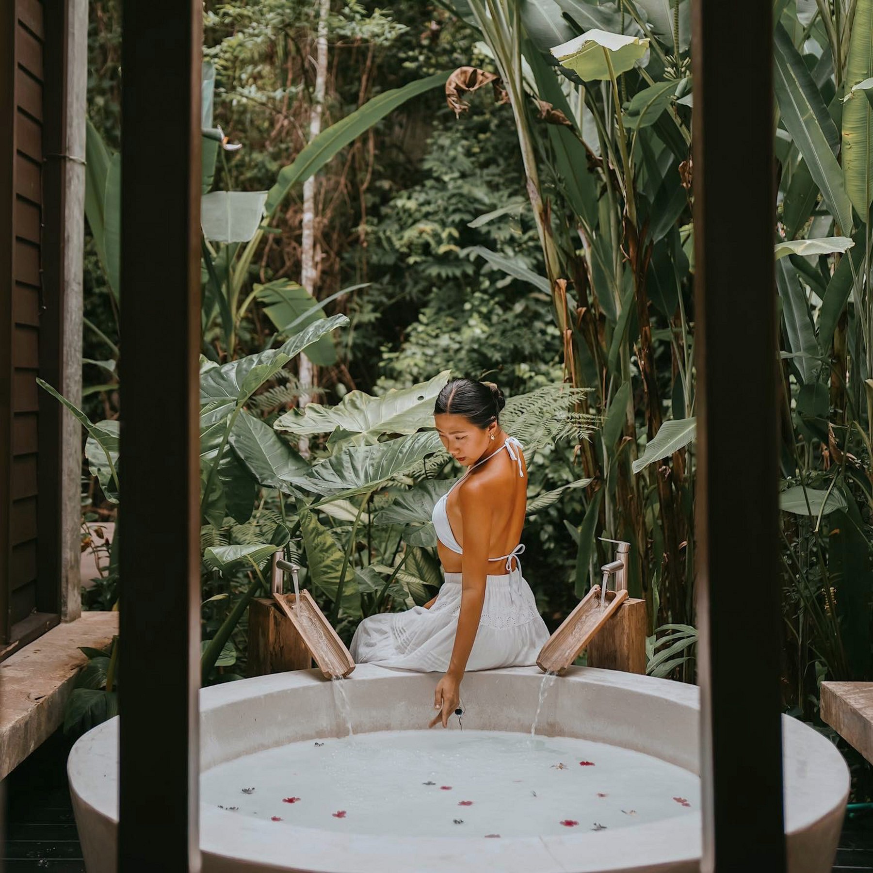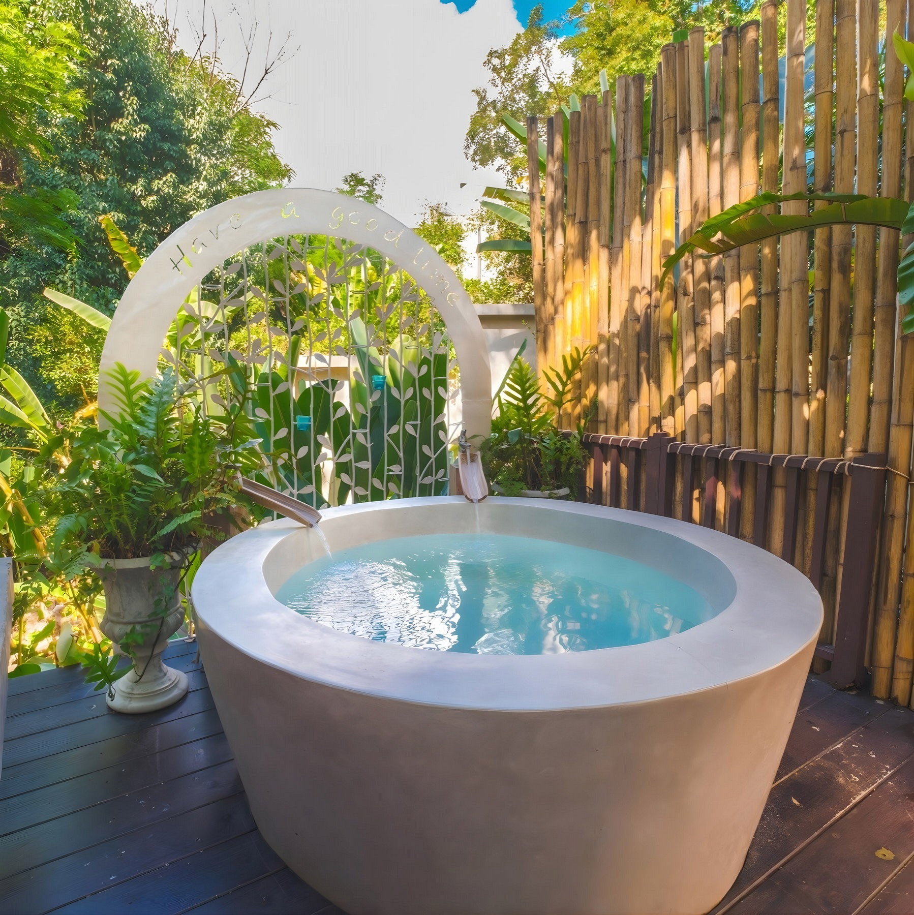 The white wallpaper and big round bathtub on the waterside allow customers to unwind themselves in the nature along with the aroma treatment salts. There is also a dock to sit and dip your feet in the stream.